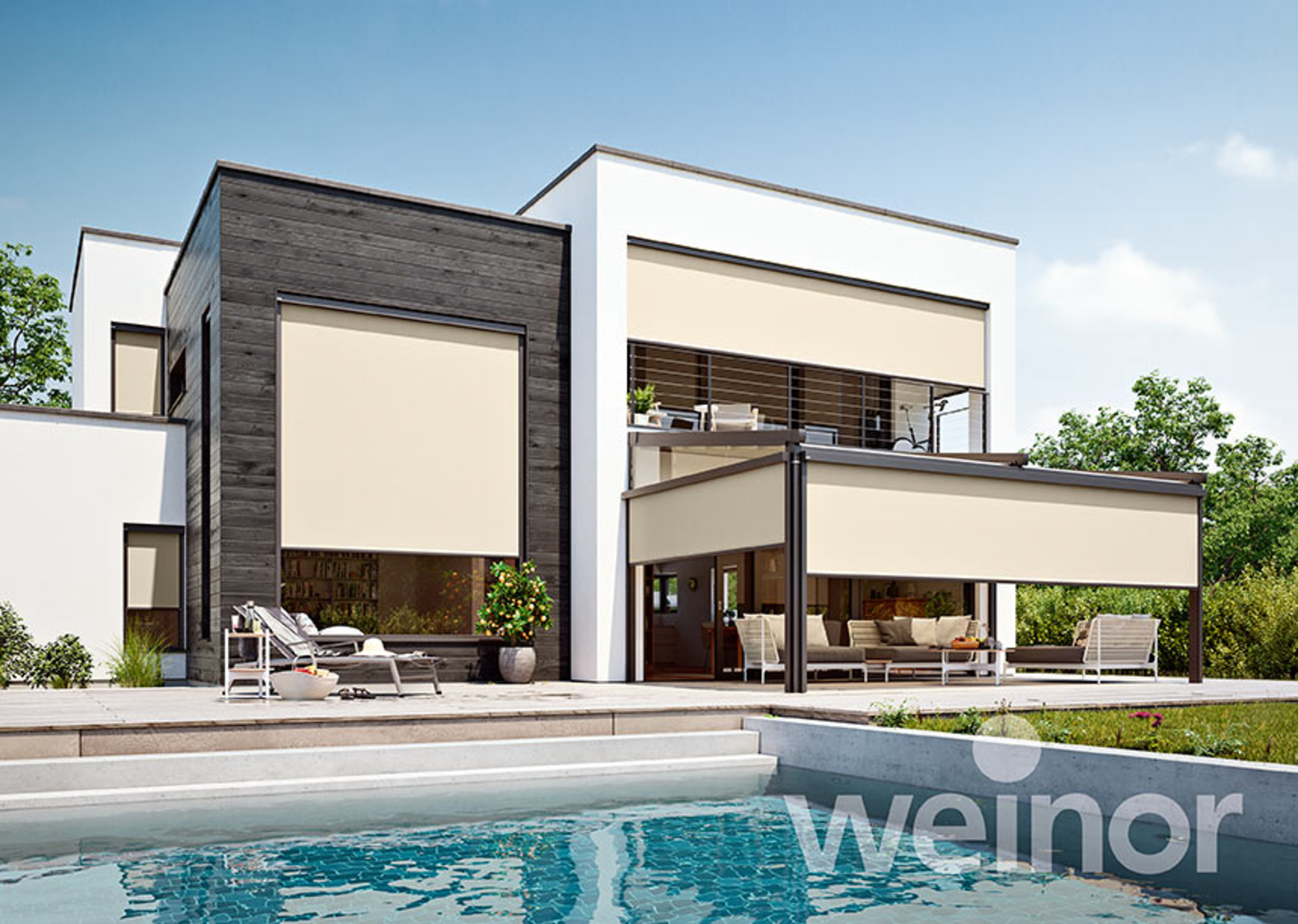 Die Senkrecht-Markise VertiTex II schützt vor blendender Sonne, dem Aufheizen von Terrasse und Innenräumen sowie neugierigen Blicken. Egal, ob Terrassendach, Pergola-Markise, Fenster, Balkon oder Wintergarten: VertiTex II passt immer. Durch ihre kompakte Bauweise, die zahlreichen Varianten und vielseitigen Sicht- und Wetterschutz-Funktionen ist sie ein wahrer Alleskönner unter den Senkrecht-Markisen. Und ihr unauffälliges Design verleiht Ihrem Haus an jedem Platz eine tolle Optik.