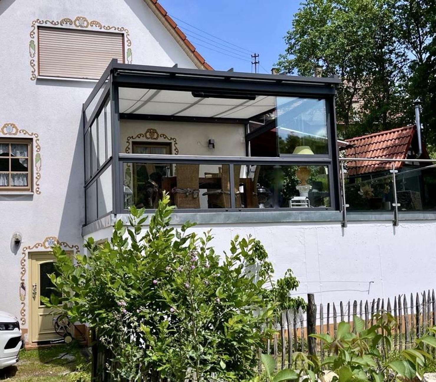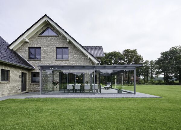 Das elegante, kubische Terrassendach Terrazza Pure harmoniert optimal mit geradliniger moderner Architektur und lässt sich mit Glaselementen problemlos zur Glasoase ausbauen.